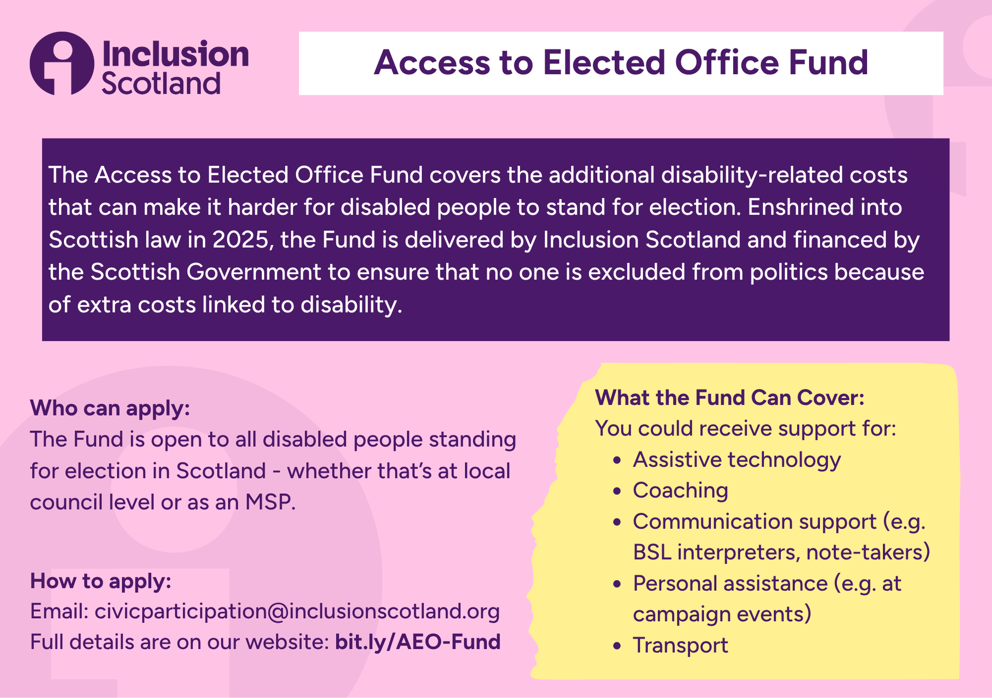 The Access to Elected Office Fund (Scotland) is paid for by the Scottish Government and run by Inclusion Scotland.